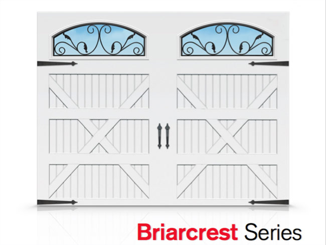 Una sección superior de 24" muestra opciones exquisitas de ventanas en una amplia selección de estilos de paneles según las puertas de los antiguos garajes de carrozas. Ya sea que escojas la confección estilo viejo-mundo del gran hierro forjado , la simplicidad clásica del trazado cuadricular o del gran cristal, ya la vista a mejorado. El balance perfecto entre belleza excepcional y calidad duradera, una puerta de garaje Briarcrest va a transformar tu hogar de lo ordinario a lo extraordinario.